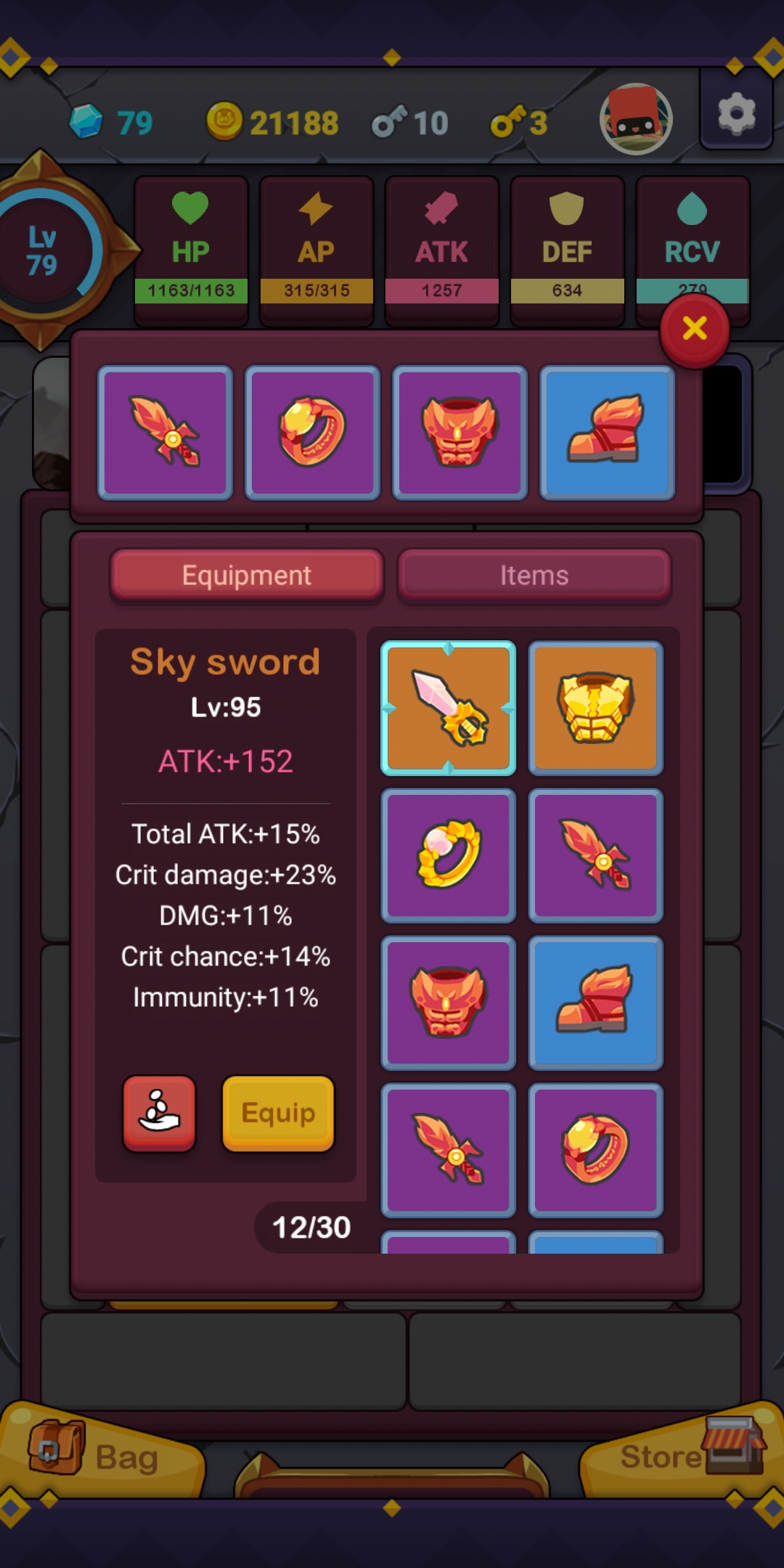 Your character has 5 types of skill points, but you can only invest in 3 – HP, ATK or DEF – all of which fairly self explanatory. You will also be able to equip loot that you find, be it a weapon, chest piece, helmet or shoes. Equipment uses established RPG colour and naming hierarchy (Common, Rare, Epic, Legendary). There are also set bonuses for some legendary equipment that will give you extra bonuses. The game has a main story mode and every 5 stages you will reach some sort of base, where you can go on an adventure (independent of the story, for grinding), grow seeds (you can spend fruits on stats upgrades), replay old levels or buy items. You can also go on a one off adventure, which is essentially a single floor of a dungeon and you don’t regenerate health over time, sometimes these can end a lot quicker than expected.