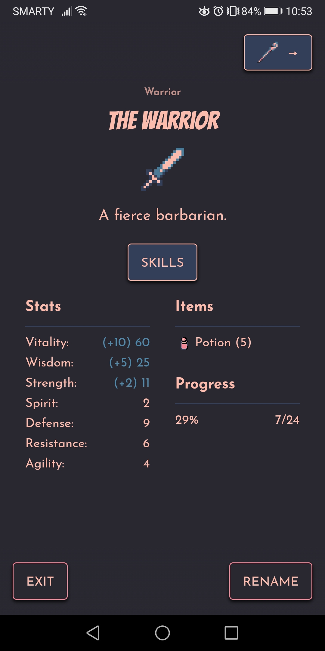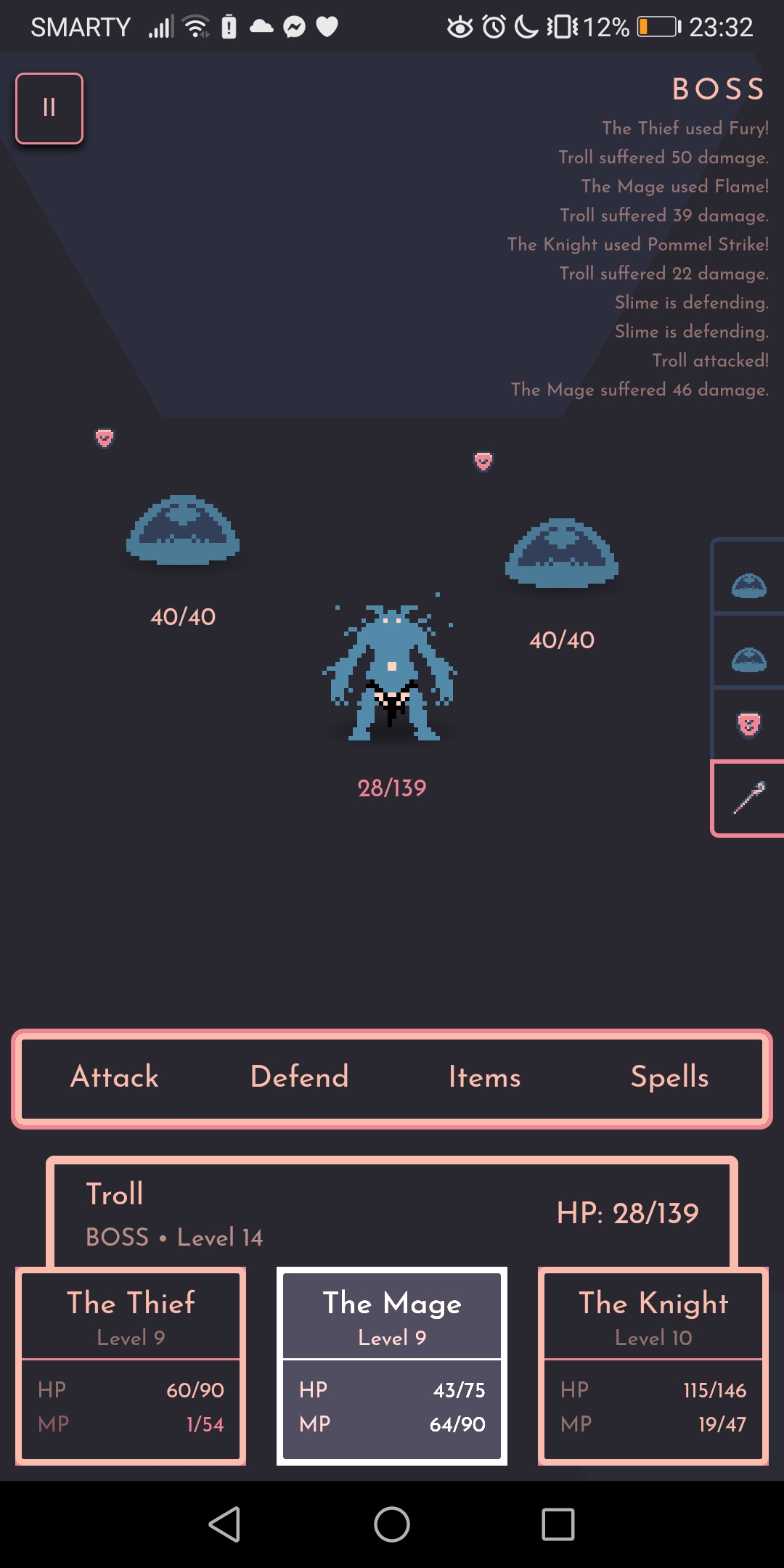 You can pick what difficulty gauntlet you’d like to start, after which you select your fighters – initially there are 4 classes available and more can be unlocked through cash or in-game currency. The 4 base classes are Warrior, Thief, Mage and the Knight – each offering different stats and its own skill tree. Once you’ve selected your 3 fighters you are plunged into the gauntlet and you’ll start fighting waves of enemies. The game will cycle through your characters allowing to choose your moves – attack, defend, use items or cast spells. Beat all the floors and you’ll have mastered that gauntlet.