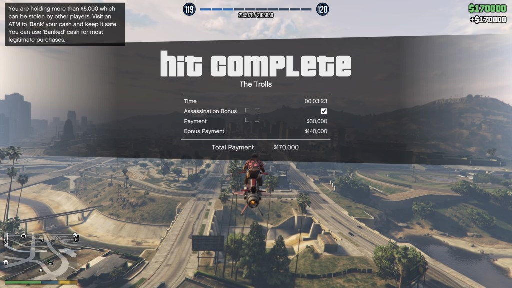 In addition to these jobs, the update has also added payphone hits. A throwback to the original story mode and some of the older games, the player is tasked with carrying out hits against various VIP targets across the city. Each hit comes with a variety of ways in which it can be completed in order to gain the hit bonus, which massively increases the pay for the kill from $15 000 to a total of $85 000.