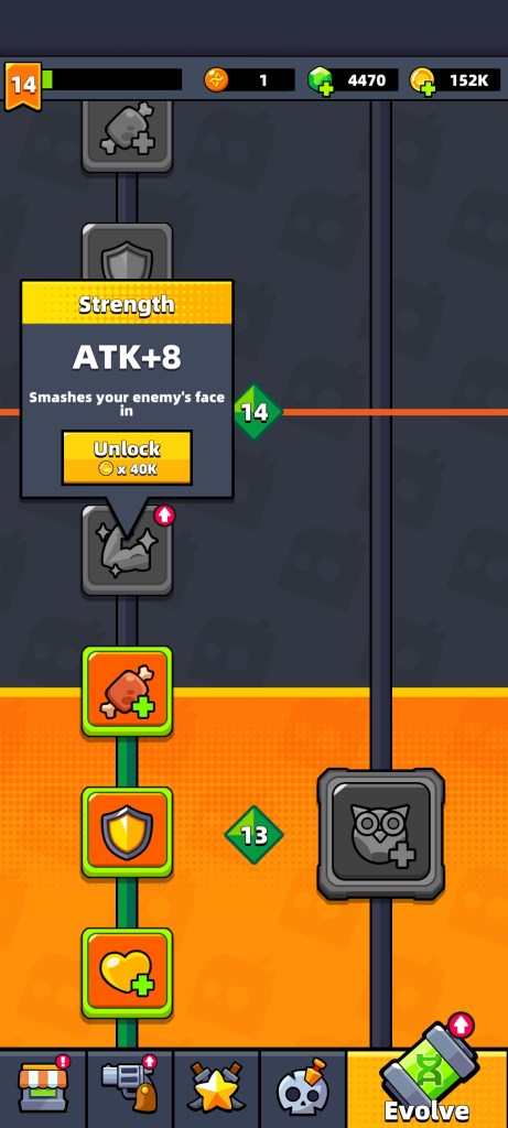 The game progresses through levels – each lasting from 6 to 15 minutes of progressively harder enemies and bosses. There are also additional challenge modes that will make past levels even harder and push you to the limit. These will give you evolution points which allow you to unlock some really useful upgrades. As you progress in the game your character will also level up and allow you to upgrade their stats with cash. The gatcha element also comes in with your characters equipment – you open loot boxes and merge duplicates as you try to improve the quality of your equipment from common to legendary. There are unique seasonal and daily challenges and over 50 chapters to the game with more being added.